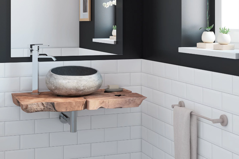 Lavabo de ónix con encimera raíz de teca