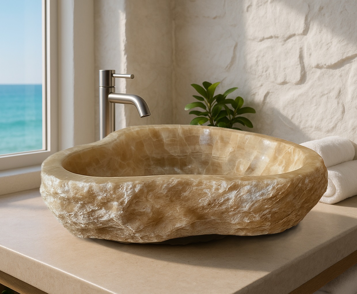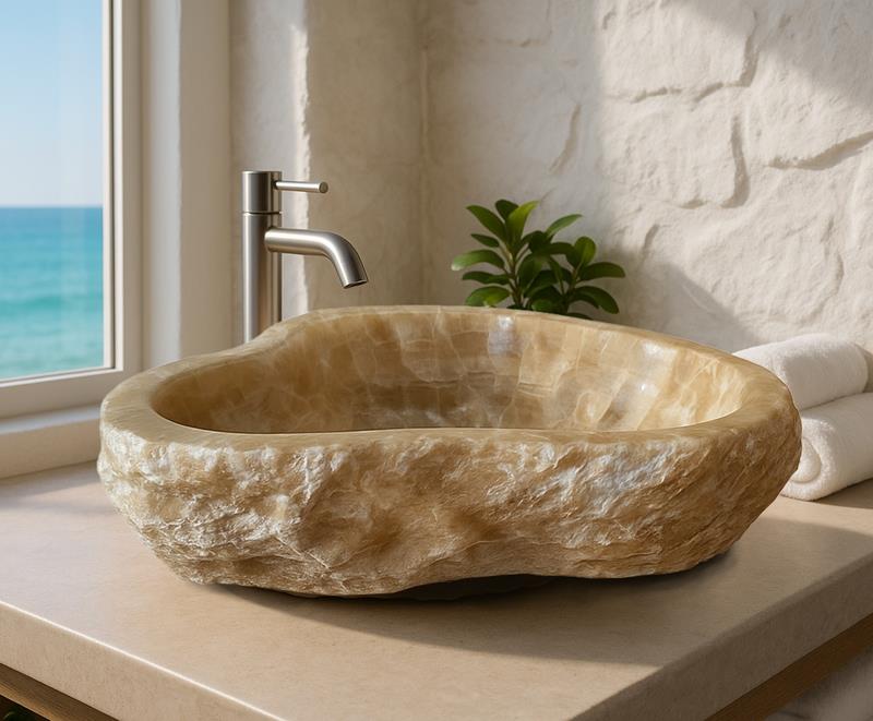 Este lavabo de ónix ha sido esculpido a mano a partir de una joya de la naturaleza. Sus suaves vetas en tonos miel parecen capturar la luz gracias a su cristalización tipo cuarzo, envolviendo tu baño en una atmósfera cálida y serena. Cada pieza es única, como una obra de arte forjada por el tiempo, pensada para quienes buscan no solo funcionalidad, sino belleza y alma en cada rincón de su hogar.