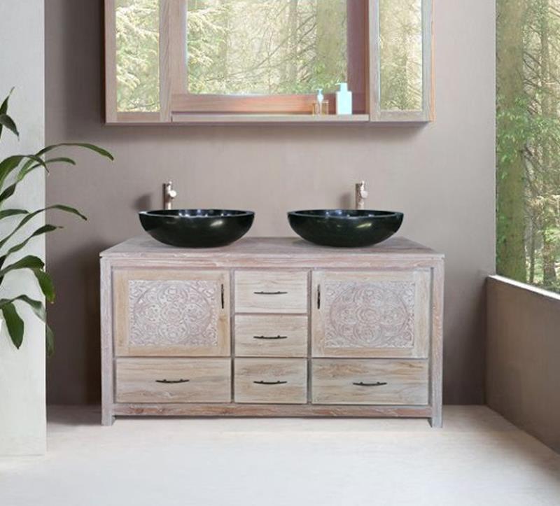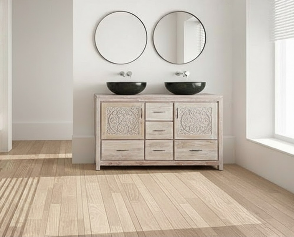 Elegancia natural y artesanía se unen en este exclusivo mueble de baño de teca maciza, realizado completamente a mano. Su acabado encerado en blanco ilumina el espacio y resalta la belleza de las vetas de la madera, aportando una sensación de calma y pureza.