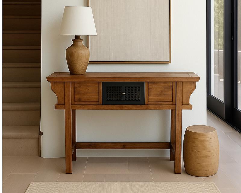 Eleva la distinción de tu espacio con esta consola única, elaborada a mano en selecta madera maciza de teca. Su fabricación artesanal, mediante ensamblados tradicionales machihembrados y encolados, garantiza no solo una estructura impecable sino una pieza concebida para perdurar. El exquisito acabado en tono avellana, enriquecido con delicadas vetas texturizadas en gris, revela la nobleza natural de la madera y añade una sutil sofisticación. Una obra de alto diseño que trasciende lo funcional y viste tus estancias con un aura de exclusividad, refinamiento y lujo atemporal.